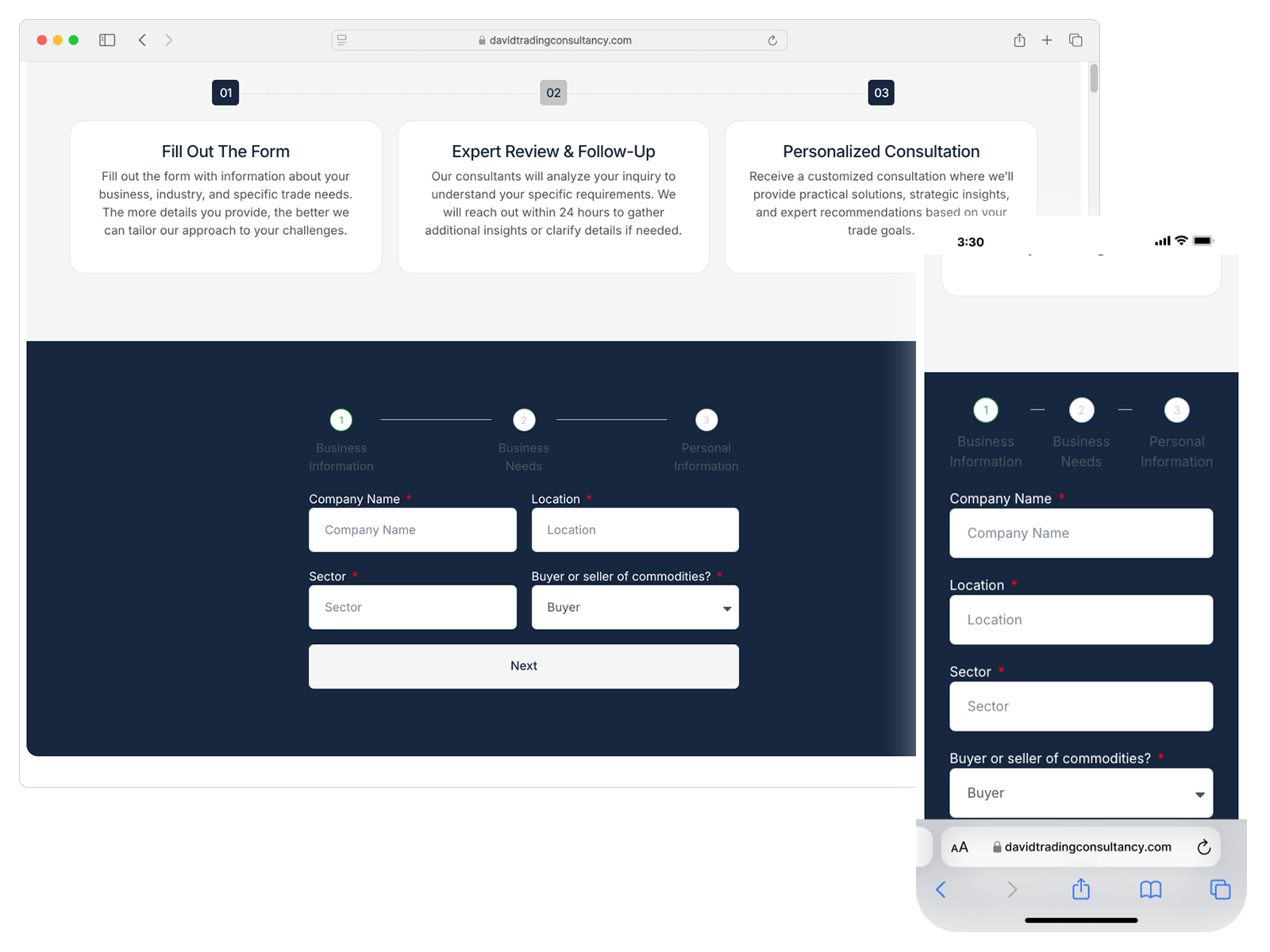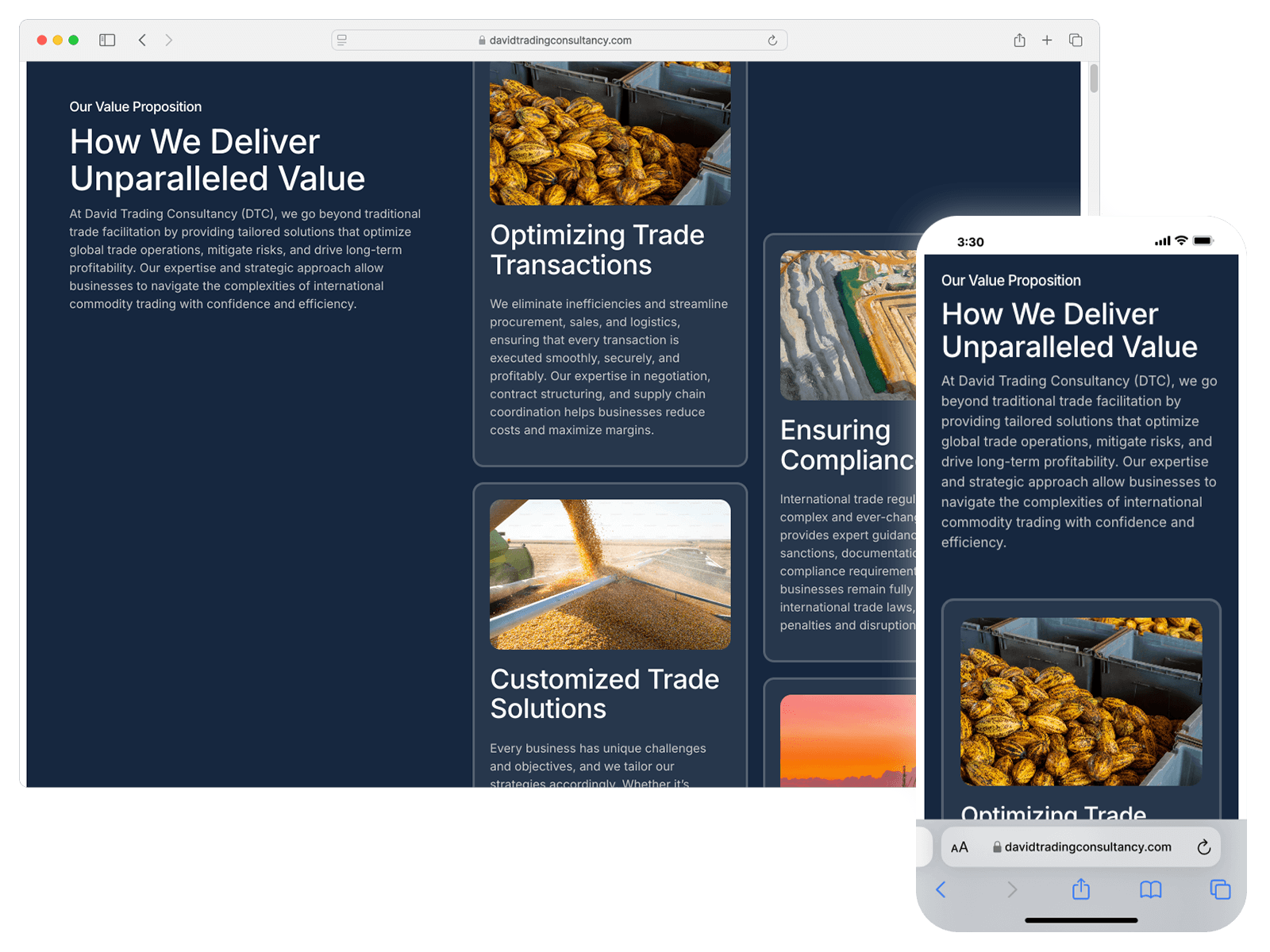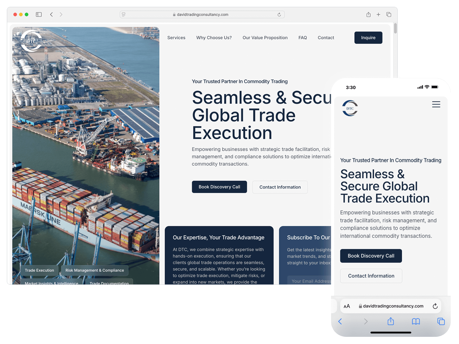 Through Digintly’s expertise in web development and design, David Trading Consultancy (DTC) now has a professional, lead-focused website that reflects its authority and reliability in the international commodity trading sector. The site communicates DTC’s services with clarity, builds trust through a polished visual presentation, and provides a streamlined way for potential clients to engage. Key outcomes include:
